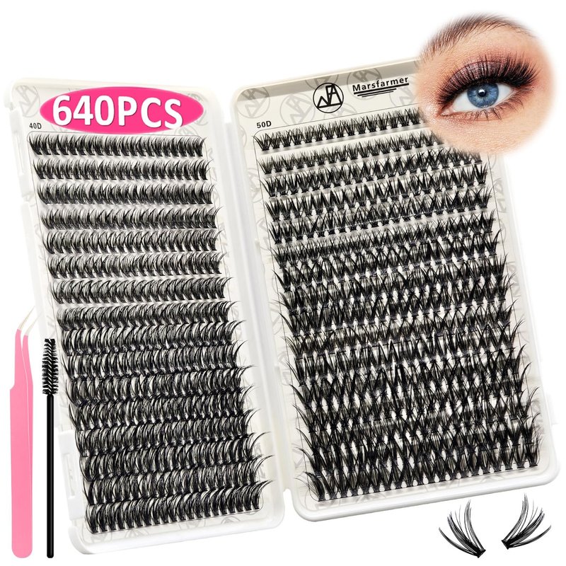 Marsfarmer 640pcs Lash Clusters Kit - 9-16mm 40D+50D D Curl Individual Lashes Clusters, DIY False Eyelashes Clusters Extension with Lash Cluster Applicator Tweezer