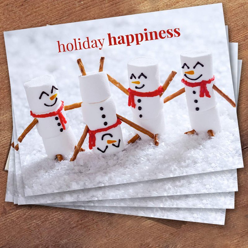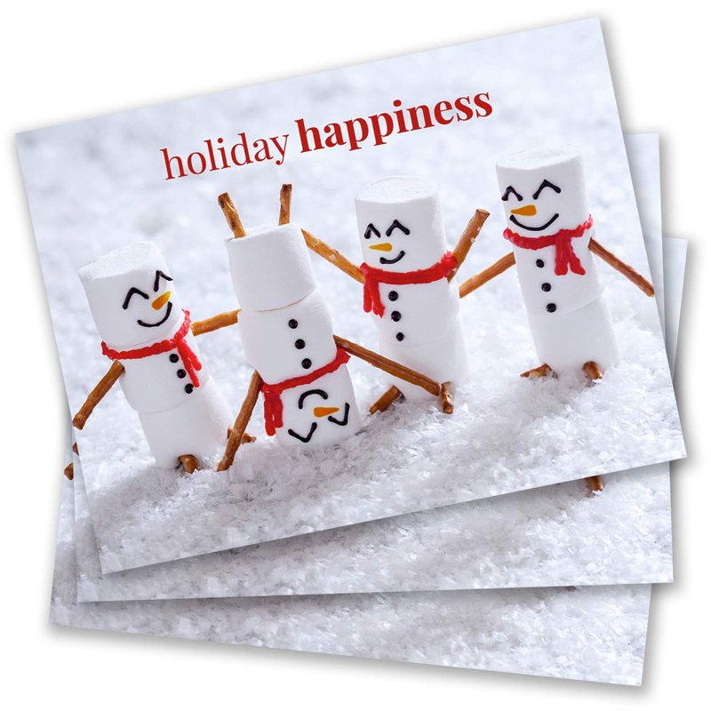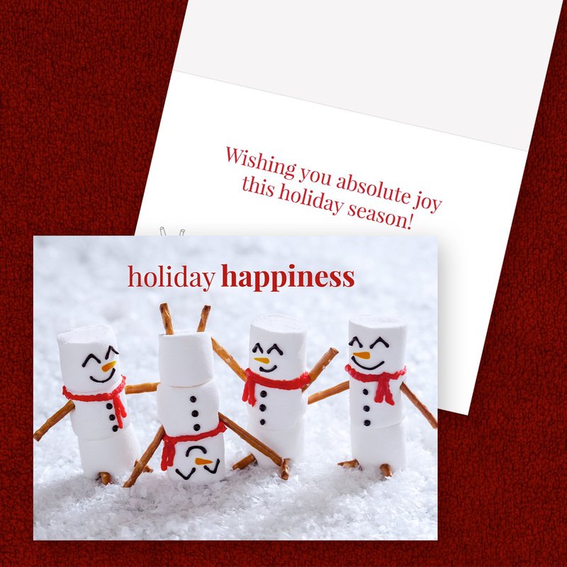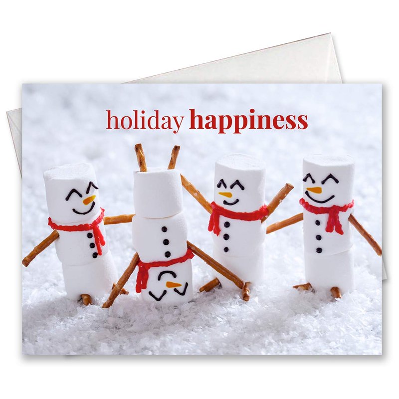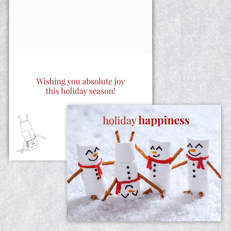 - Design: Smiling "Holiday happiness" marshmallow snowmen with an inside verse: "Wishing you absolute joy this holiday season!" Send loved ones warm wishes with this adorable card this season.