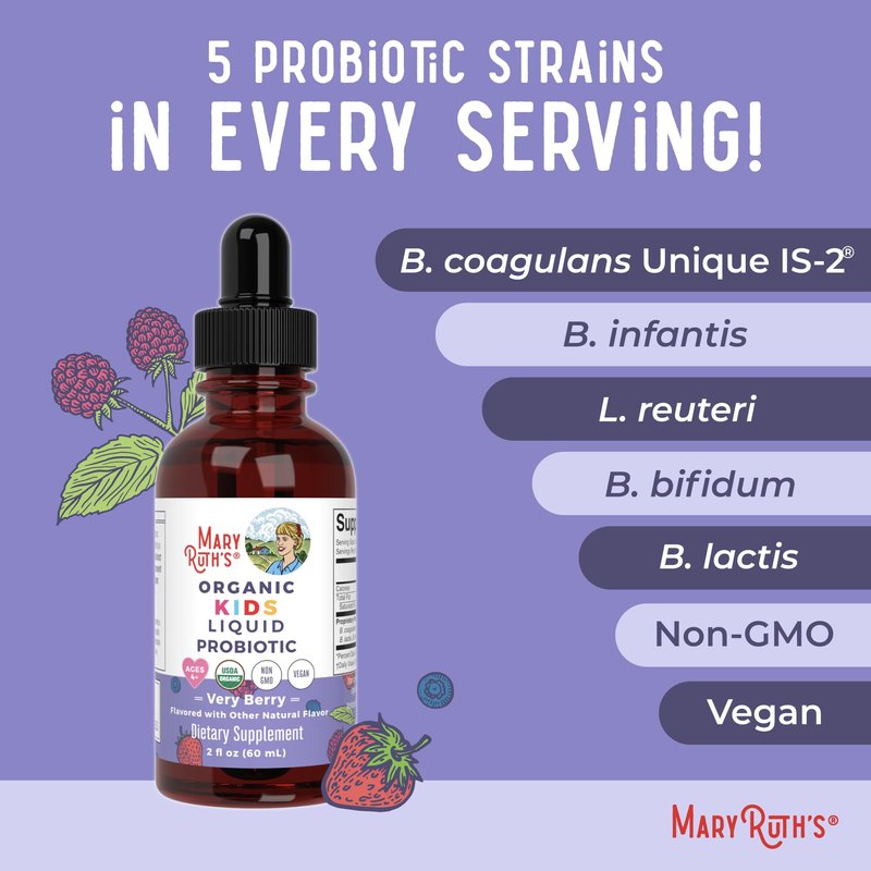 - Liquid Kids Probiotic: Support your growing child’s microbiome development and gut health! This USDA organic probiotic contains a proprietary blend of five strains: Bacillus coagulans Unique IS-2, Bifidobacterium lactis, Bifidobacterium infantis, Bifidobacterium bifidum, and Lactobacillus reuteri.