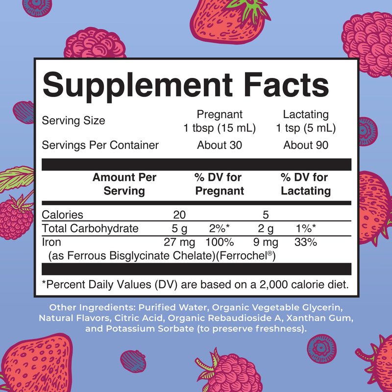This essential mineral, needed in greater quantities during pregnancy, comes in an easy-to-take liquid form to support your iron intake, in a delicious berry flavor. During pregnancy, Iron is needed for the increased production of maternal red blood cells, as well as to support the needs of the growing baby and placenta.