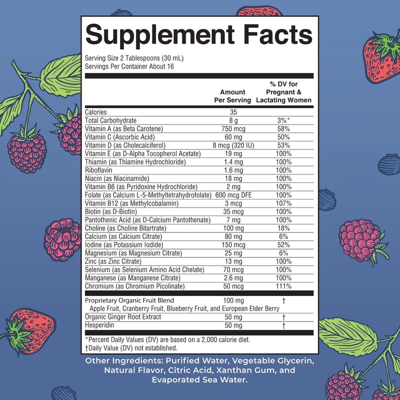 Formulated for pre-conception, pregnancy, and nursing, this liquid multivitamin has a vitamin and mineral complex to support the nutrient needs of you and your baby before, during, and after pregnancy. Containing 600 mcg of folate as folinic acid, this multivitamin is designed for those who may prefer supplementing their folate as folinic acid. This multivitamin is designed to help prepare your body for pregnancy and promote healthy fetal development. With ingredients like vitamin A as beta carotene, choline bitartrate, and potassium iodide, you know you’re providing important nutrients for you and baby. Also included are selenium ginger, vitamin C, D, E, B complex vitamins, and more. No more pills! Help prepare your body for pregnancy and promote healthy fetal development with this tasy berry-flavored liquid multivitamin.