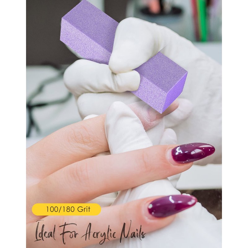 - MEDIUM GRIT BUFFER - 100/180 grit is the most comfortable scrub, #100 grit is best for shortening and shaping artificial nails. #180 grit is best to prep the natural nail for nail application, or a smoother finish after the use of #100 grit.