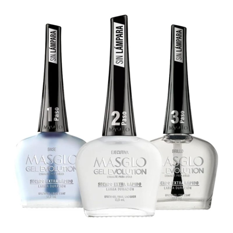 MASGLO GEL EVOLUTION Nail Polish Gel Effect, No UV/Led Lamp, Duration Up to 12 days, 3 PCs Base, Esmalte Color, Brillo (Ejecutiva, Base y brillo)