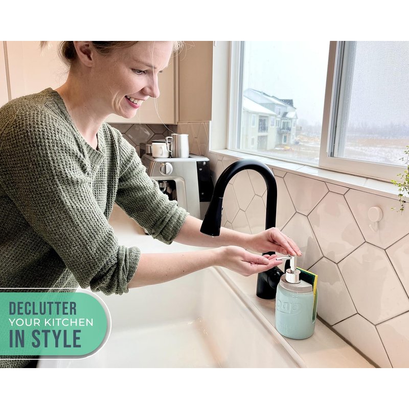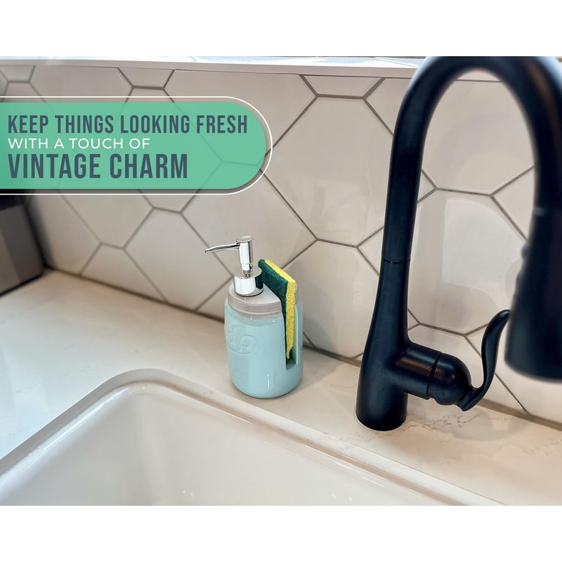 - Decorative soap dispenser & sponge holder: Keeping your kitchen nice and tidy is no easy job to do, so we thought we could give you a hand by creating a kitchen product that will save you space and keep everything where it’s supposed to be. 7.5" Height and 3.75" Width.