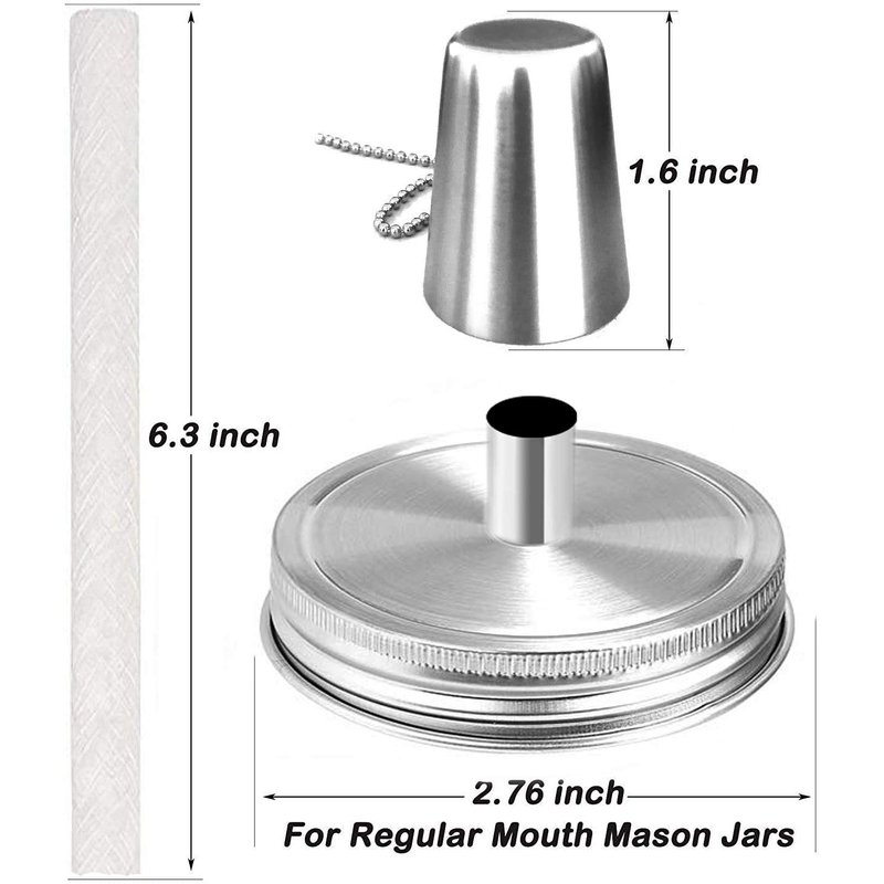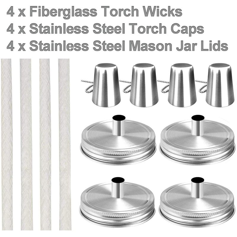 Mason Jar Tabletop Torches Kits,4 Pack Regular Mouth Lids with Protective Tube,Long Life Fiberglass Wicks and Caps,Outdoor Oil Lamp Lights for Patio Garden Camping Decor Specification: Mason jar lids:Silver Lids Protective Tube:stainless steel Wicks:Fiberglass (Gloves are recommended) Package included: 4 x Protective Tubes 4 x Fiberglass Wicks 4 x Silver Lids 4 x Caps with Chain