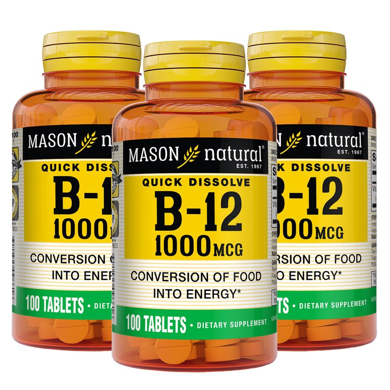 MASON NATURAL Vitamin B12 1000 mcg Quick Dissolve - Healthy Conversion of Food into Energy, Supports Nerve Function and Health, Suitable for Vegetarians, 100 Tablets (Pack of 3)