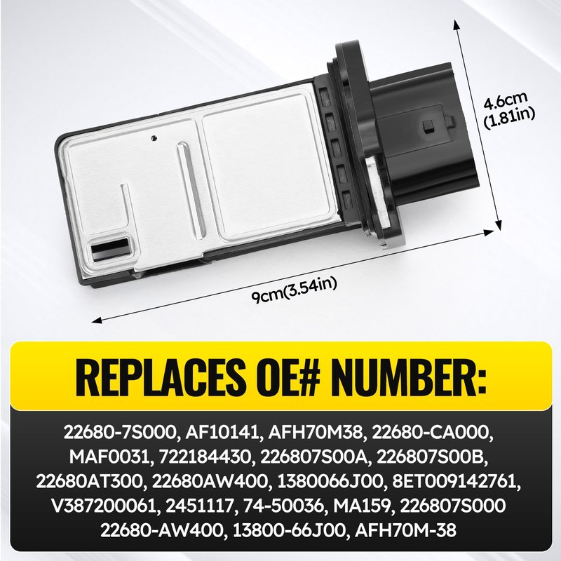 - Replaces Multiple Part Numbers: Replaces OE part numbers 22680-7S000 AF10141 AFH70M38 22680-CA000 MAF0031 722184430 226807S00A 226807S00B 22680AT300 22680AW400 1380066J00 8ET009142761 V387200061 2451117 74-50036 MA159, commonly found on various Infiniti, Nissan, and Suzuki vehicles.