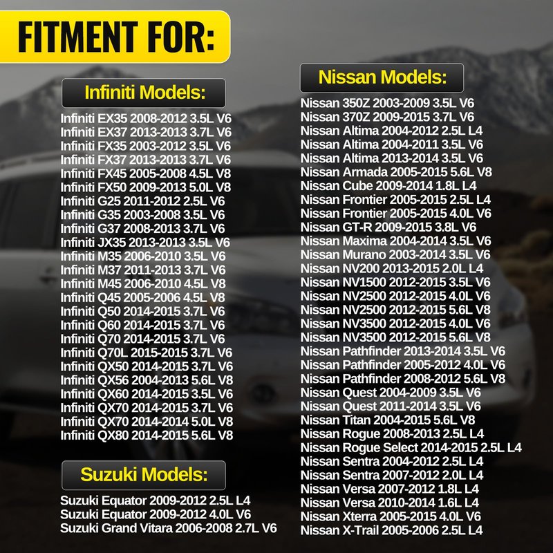 - Wide Compatibility: This Mass Air Flow Sensor is specifically designed for a wide range of Infiniti, Nissan, and Suzuki models, including Infiniti G35 G37 QX56,Nissan 350Z 370Z Altima Maxima Frontier Murano Titan Xterra and Suzuki Equator, ensuring extensive applicability. Please ensure compatibility with your vehicle's specific year, make, and model before purchasing.
