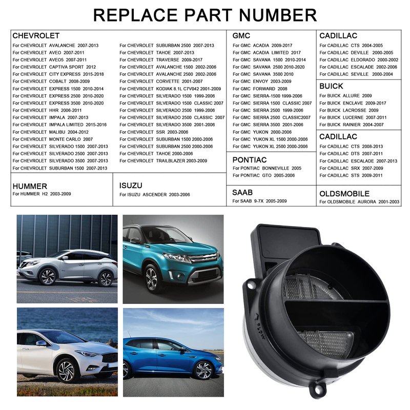 - MAF 2516849 fit Cadillac Escalade ESV EXT 2002 - 2006| 2002 - 2006 Chevy Avalanche 1500, 2500 | 1999 - 2006 Silverado 1500 | 2007 Silverado 1500 Classic | 2000 - 2006 Suburban 1500, 2500 | 2000 - 2006 Tahoe | 2003 - 2009 GMC Envoy | 1999 - 2004 Sierra 2500 | 2000 - 2006 Yukon, XL 1500, 2500 | & more.