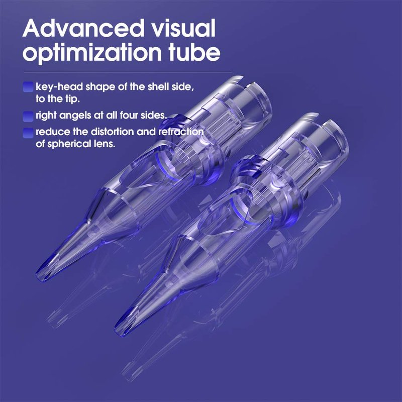Cartridges are the economic version MEMBRANE system cartridge needles for the professional tattooist with quality assurances, fits for all standard cartridge grips & tattoo pen machine. Light clear colors tip body, better visibility,Low profile housing & better ink flow & shaped on the