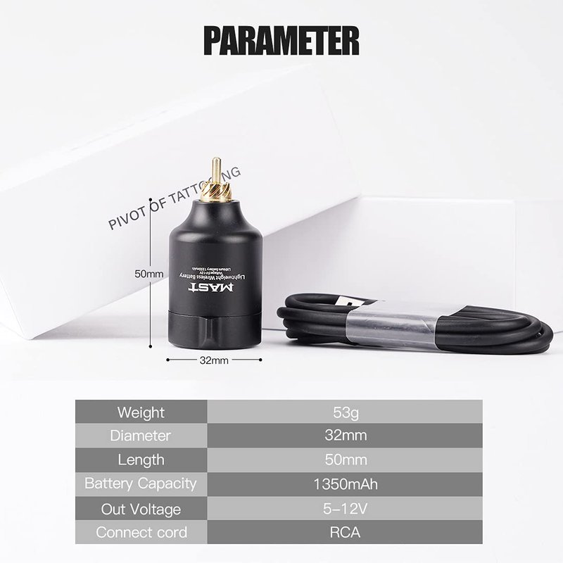 - 【Specifications】Mast T1 wireless tattoo battery is small and exquisite with only 53g weight ,Length: 50mm.This wireless power supply is perfect for any length of tattoo pen machine.Battery capacity: 1350mAh,normal enough to complete a tattoo works .