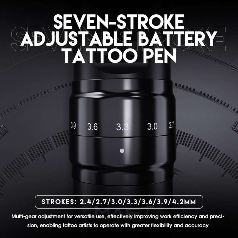 - Adjustable Real 7 Strokes Length: This wireless tattoo pen offering 7 strokes 2.4mm, 2.7mm, 3.0mm, 3.3mm, 3.6mm, 3.9mm, 4.2mm options, change your stroke on the fly just by turning the adjustment knob, lets you tattoo in any style with ease, great for applying soft black and grey, packing color and blending and lining. Mast tattoo tech give you more choice