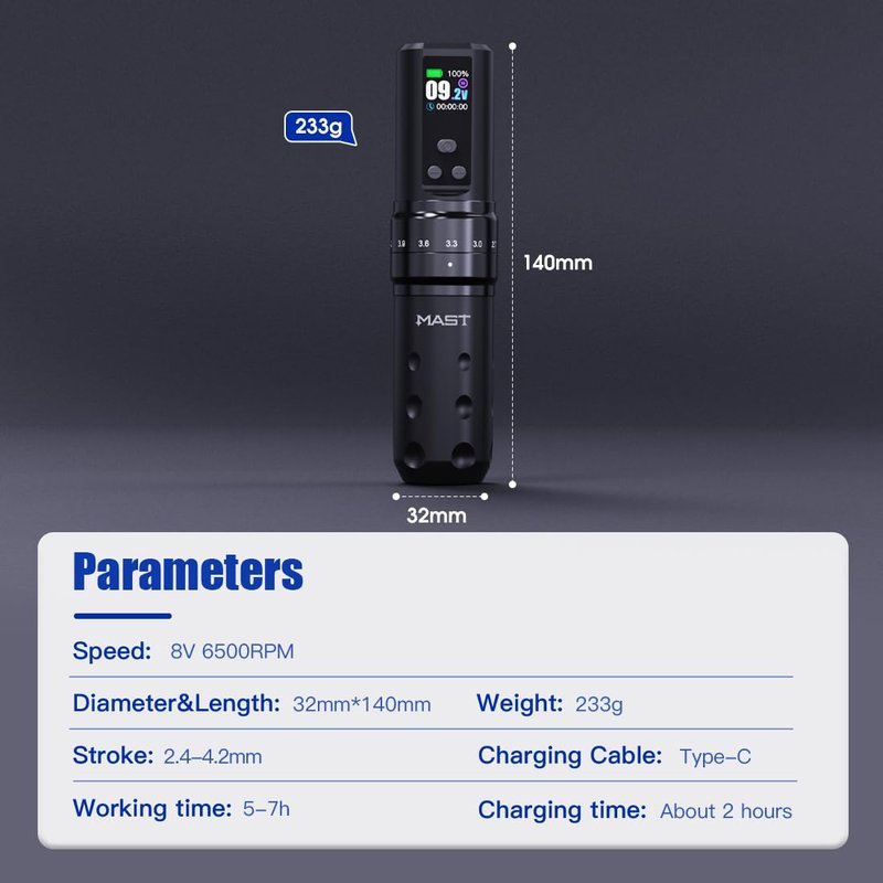 - Wireless Tattoo Gun Pen: Mast Fold2 pro length 140mm/5.5in, weight 233g, standard 32mm grip for great comfortable control, battery work up to 7 hours.