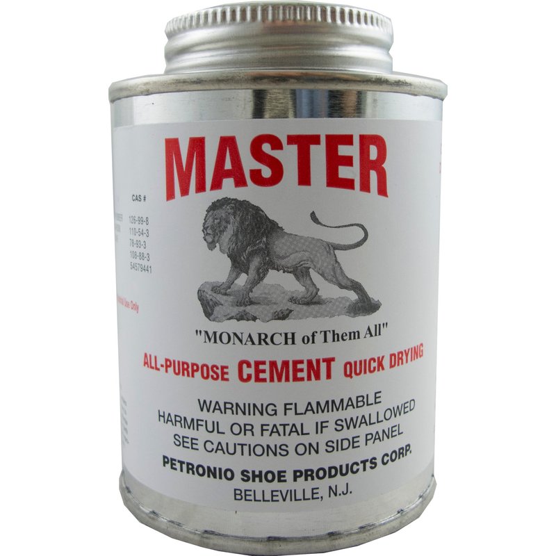 Masters Contact Cement 8oz Used on wood, rubber, cork, metal, Vinyl, Material, Canvas, and more Strong contact cement will glue together several pieces of leather comes with brush in cap Great for leather working, shoe cobblers, and more Click here for step by step directions on how to use Master Contact Cement goes on and dries clear dries quickly