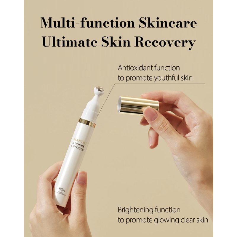 - MASTIC 6-HOURS AMPOULE DROPPER features potent natural ingredients including Mastic Gum and Fermented Mastic to promote illuminated, even skin tone and improve elasticity. The dropper-type bottle facilitates convenient and even application for quick absorption.