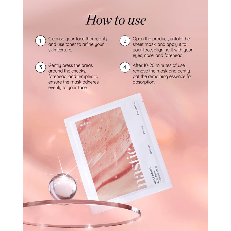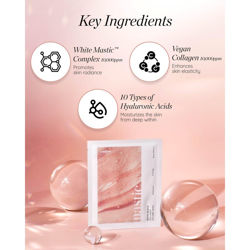 - MASTINA WHITE MASTIC COLLAGEN VOLUME MASK (20ml/0.67fl oz x 4 pieces) - Indulge in the ultimate self-care with our White Mastic Collagen Volume Mask. This skin radiance-boosting and firming sheet mask is a powerhouse of skin-revitalizing ingredients, delivering a spa-like experience to revive your tired and sagging skin. Unveil a more radiant and resilient complexion with every use.