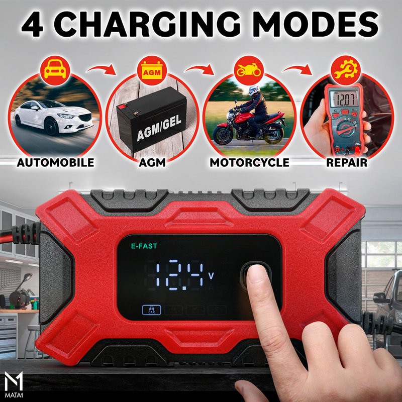 Say goodbye to sluggish starts and hello to unstoppable adventures!The Mata1 Smart Pulse Repair Battery Charger is specifically designed to revitalize your car's battery, infusing it with new life. With its versatile 4 charging modes, it delivers rapid and dependable charging, ensuring you stay on the move with confidence. Its compact design allows for easy storage and portability. Additionally, it boasts a range of advanced safety features, including flame-retardant ABS construction, short circuit protection, reverse polarity protection, and temperature compensation, all working together to provide maximum safety and peace of mind. Moreover, it comes with a smart LCD screen display that allows for effortless monitoring of the charging status and detailed information. Don't wait any longer, choose the Mata1 Smart Battery Charger and experience a fresh surge of energy in your automotive life. For all charging needs, make it Mata1!