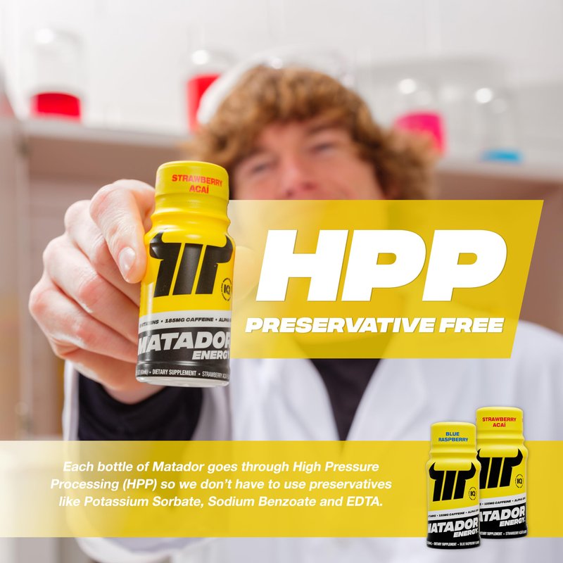 MATADOR ENERGY shots, is deliciously tart and naturally flavored. It has 185mg of natural caffeine from coffee bean extract, 100% Vitamin B3, B6, B9, and B12.