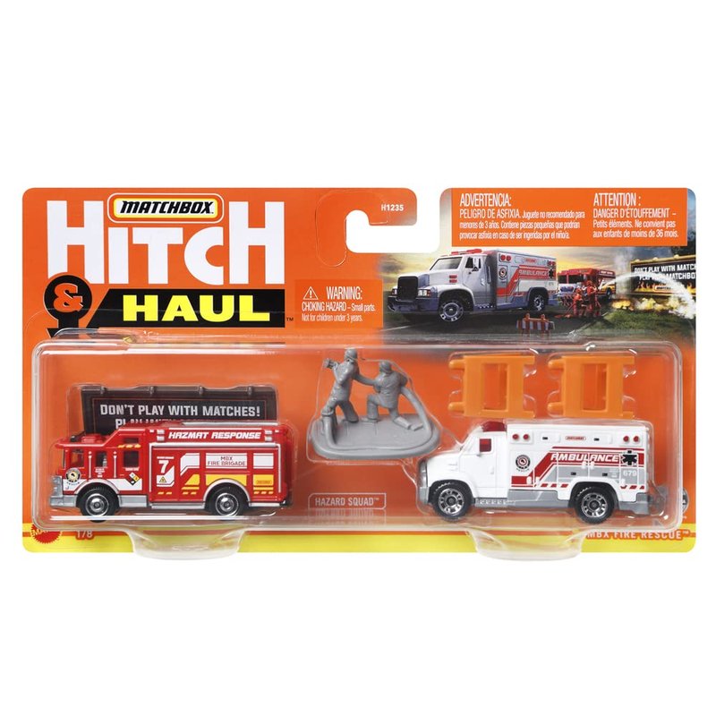 Matchbox Hitch & Haul Die-cast Vehicle Playset - Fire Rescue ~ 6 Piece Set ~ Hazmat Response Truck and Ambulance ~ Includes Firefighters, Billboard Sign and 2 Safety Barriers