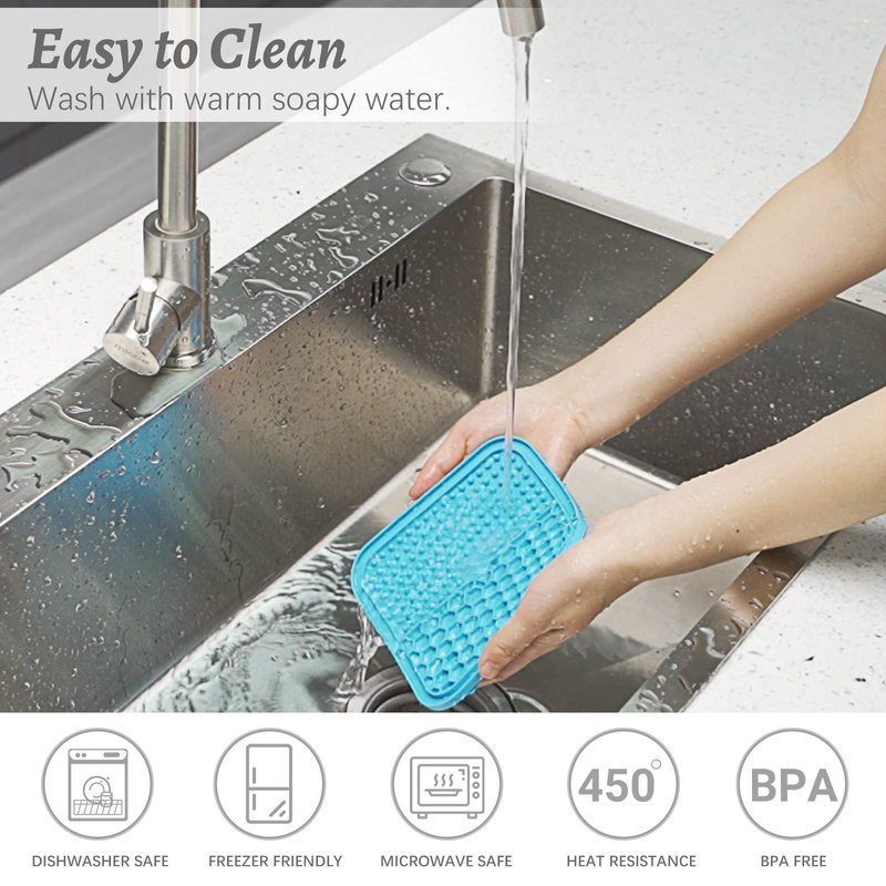 Serve yogurt, peanut butter, spreadable treats and all organic and healthy treats. Food settles on the mat's surface, slows the feeding dramatically and prolongs enjoyment. Our dog lick mat and dog mind stimulating toys textured surfaces promote pleasurable licking action, which generates saliva helping protect your pet's teeth and gums.