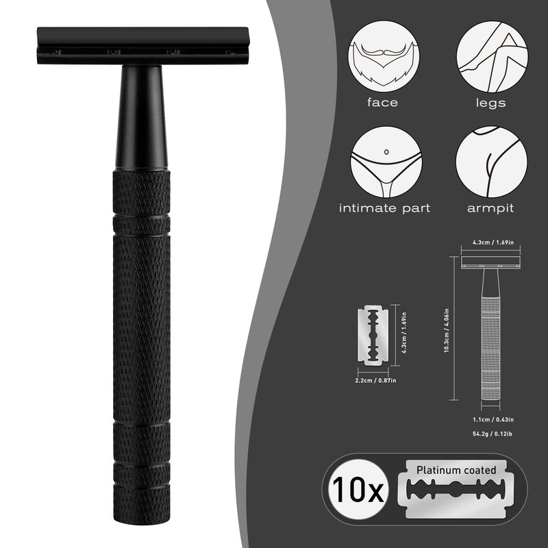 Matte Black Double Edge Safety Razor for Men, with 10 Platinum Coated Double Edge Safety Razor Blades, Single Blade Razor for Men Shaving, Reusable Travel Essentials Women Razor