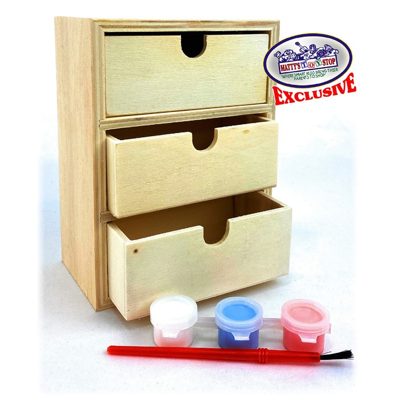 Give the gift of creativity and personalization with the Matty's Toy Stop Design & Paint Your Own Wooden Jewelry Box Set. This delightful bundle includes three wooden jewelry boxes, each with its own mirror, 3-drawer dresser, and 4-drawer dresser. It's the perfect set for that special little person to store their trinkets and treasures in style! Each Jewelry Box Kit comes complete with everything needed to unleash imagination and artistic flair. With 3 paintbrushes and a selection of 9 vibrant paint colors (3 pink, 3 blue, and 3 white), the possibilities are endless. Let your creativity shine as you transform these wooden jewelry boxes into unique masterpieces. Crafted with high-quality wood and coated with safe, non-toxic paint, these jewelry boxes are both durable and child-friendly. The items measure approximately 6" x 5" x 3", providing ample space to store precious belongings while adding a touch of personal style. This versatile set is not only ideal for individual play but also perfect for schools, party favors, stocking stuffers, gift baskets, special needs individuals, and promotions. Spark creativity during art classes or engage in a fun family activity, creating lasting memories together. Suitable for ages 5 and up, this jewelry box set guarantees fun for the whole family. Encourage self-expression, fine motor skills, and artistic development while unleashing the imagination of your little ones. Whether you're searching for a thoughtful gift or planning a creative activity, the Matty's Toy Stop Design & Paint Your Own Wooden Jewelry Box Set is the perfect choice. Let your loved ones personalize their keepsakes and create lasting treasures that reflect their unique personality and style.