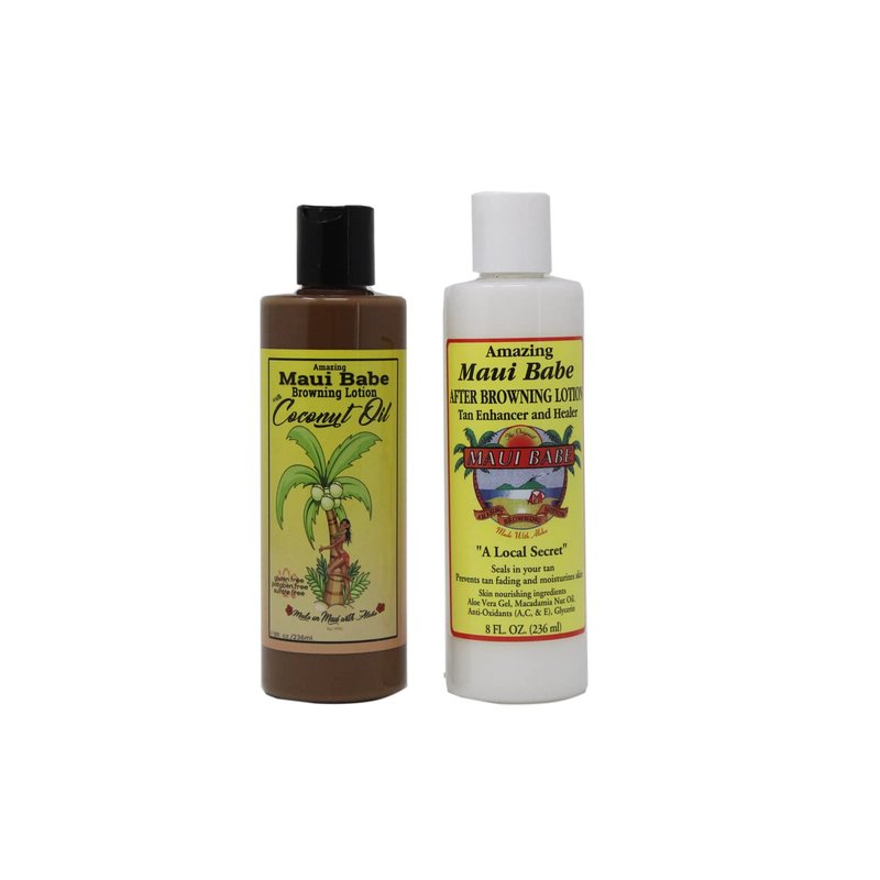 Maui Babe Tanning Pack! Includes Browning Lotion with Coconut Oil 8 oz, After Browning Lotion 8 oz, and Tote Bag! Infused With Skin Nourishing Ingredients! Prevents Tan Fading And Moisturizes Skin!