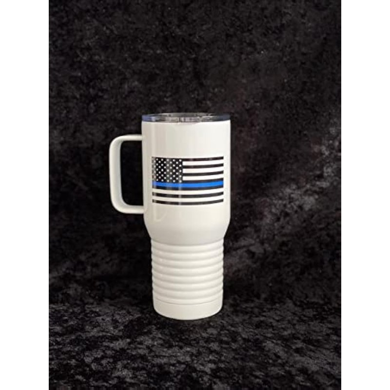 Maverick Advantage Thin Blue Line Flag Police Officer 20 Oz. Travel Tumbler Mug w/Handle & Sliding Lock Lid Vacuum Insulated Law Enforcement PD Gift Back The Blue