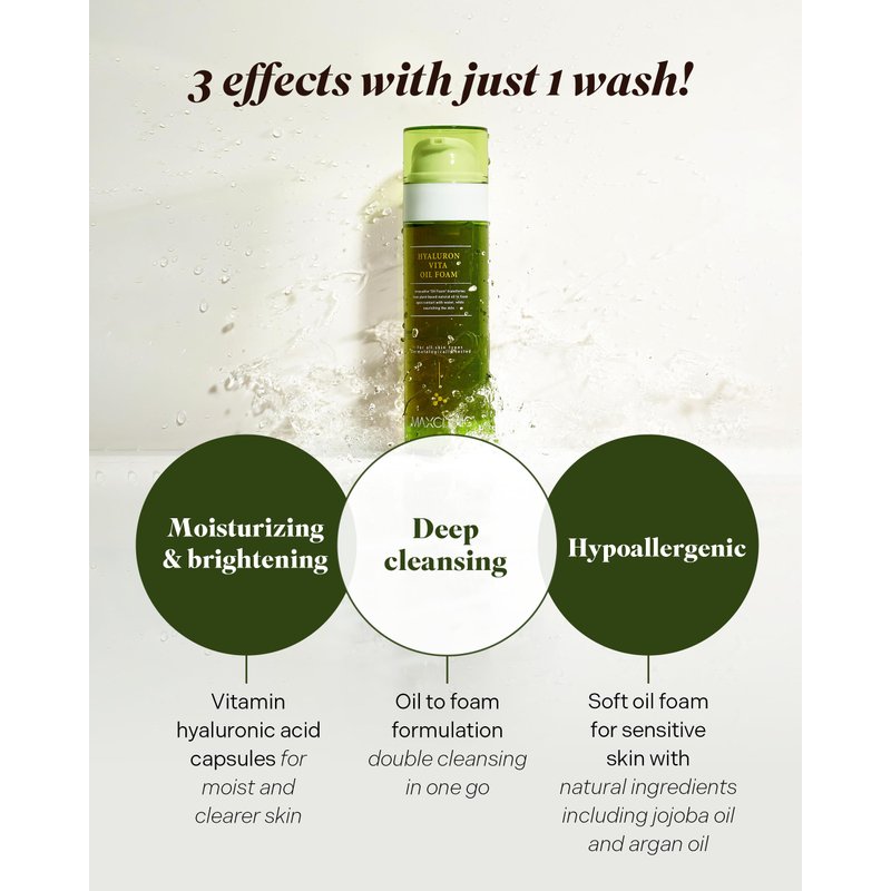 - VITAMIN-INFUSED DEEP CLEANSING. MAXCLINIC Hyaluron Vita deep cleansing oil foam combines the power of Hyaluronic Acid and Vitamin C to provide intense moisture and radiant skin. It's a Korean skin care cleanser for clean, hydrated, and radiant skin.