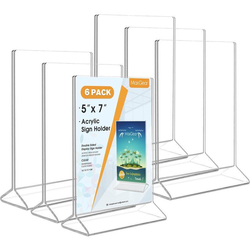 MaxGear Acrylic 5 X 7 inches Clear Sign Holder-Table Card Display-Table Menu Plastic Display Stand - Double Sided Ad Picture Frame for Office, Home, Store, Restaurant, 6 Pack