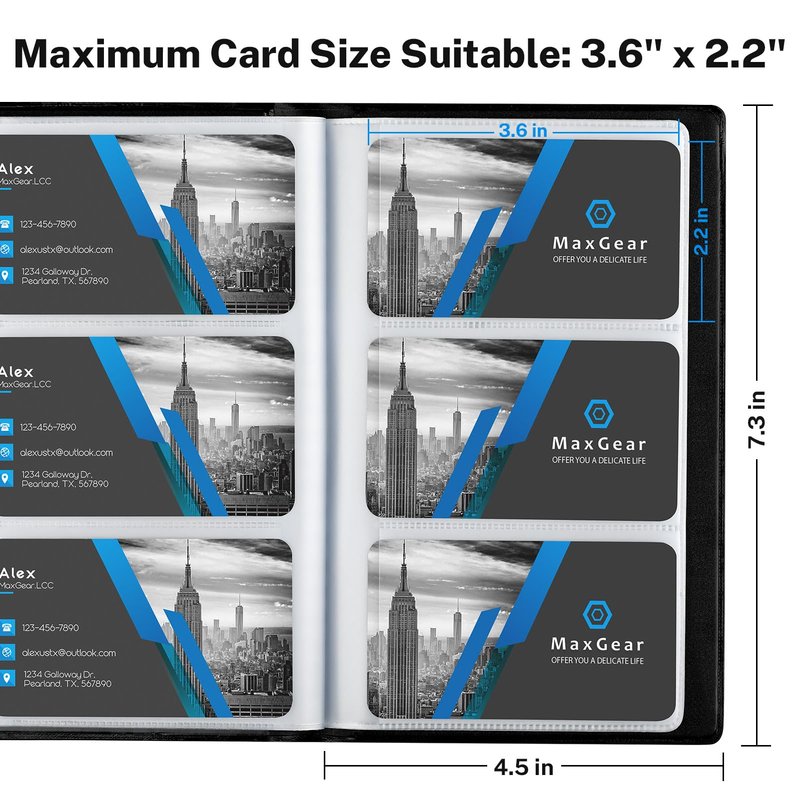 Large Capacity: This business card book can hold up to 240 business cards or 60 credit cards (depending on the card thickness). Maximum card size suitable: 3.6" x 2.2". Applicable for note cards, business and personal cards, ID and credit cards, etc. Portable & Convenient: Dimensions: 7.3" x 4.5" x 0.7". The slim profile and light-weighted design make this business card holder easy to carry. Keep your business cards nice, neat and at hand all the time. Easy to Check Through & Locate Cards: High-quality PVC sleeves are scratch proof to provide optimum clarity for easy viewing. Totally 40 Pages. Each page contains 3 individual slots that allow you to place cards back to back since pages are double-sided visible. Durable Materials: Our business card organizer is made of water-resistant and wear-resistant PU, reinforced with sealed edges and durable PVC business card sleeves. Professional Appearance: With the elegant and sleek look, book-style card holder can get you more admire and opportunity. It's an ideal gift for your family, friends, clients, associates, or as a company souvenir!