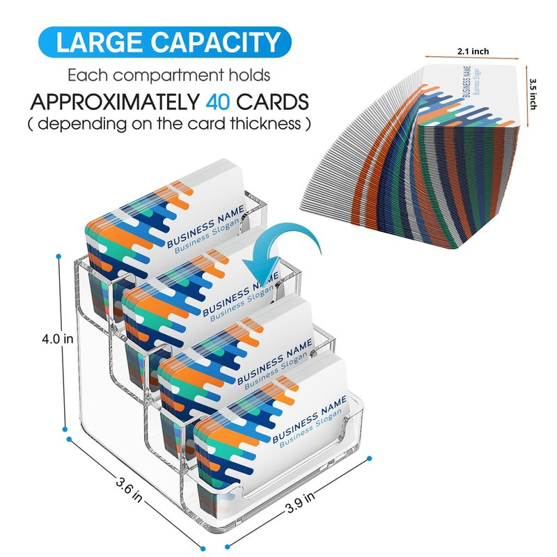Clear Business Card Holder 4 Pocket Business Card Display, Business Card Stand for Desk or Counter with 4 Tier Specification --Material: clear plastic acrylic -- Include: 2 pack*Business Card Holder --Color: Clear Business Card Holder Features Business card holder rack with 4 pockets for standard size business cards. Each compartment holds approximately 40 cards according to the thickness of your cards, 1 pack holder can store almost 160 cards. Great idea to display your business card on your office desk or exhibition, and keep your working environment neatly. Perfect for small businesses and individual departments. Made of Clear Acrylic, business card stand features a clear plastic acrylic that allows the entire front of a business card to be viewed easily, which leave a great first impression. Any questions or quality issues, please feel free to contact us.