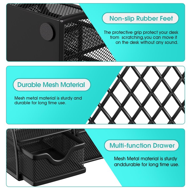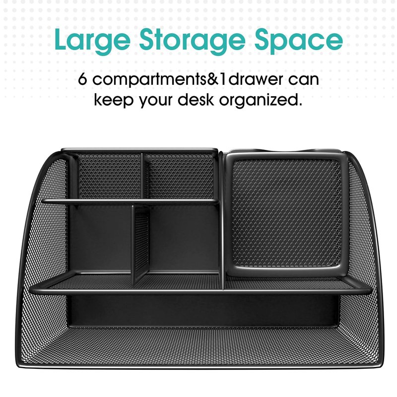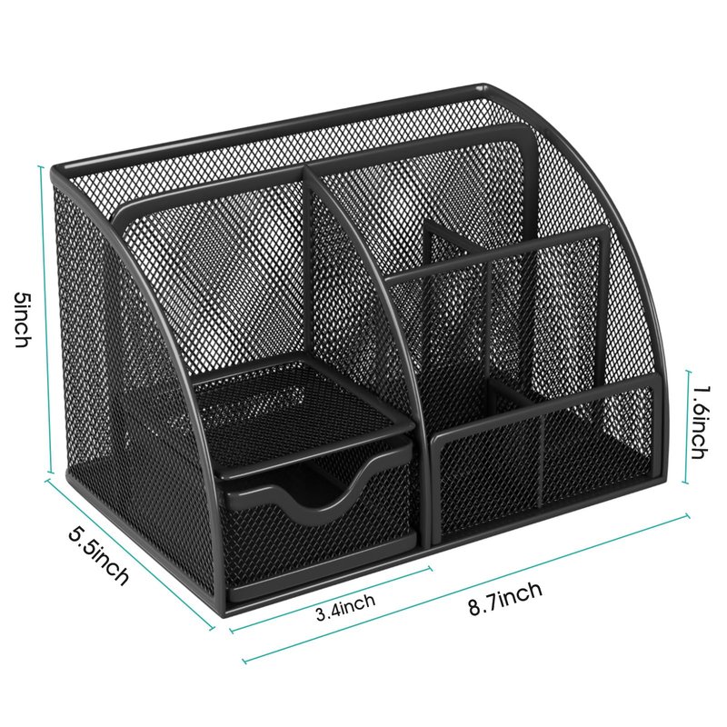 Mesh Desk Organizer Office Desktop Organizer with Drawer, Metal Stationary Organizer Black Desk Caddy, 6 Compartments Specification Material: Metal Wire Mesh Size: 8.7 x 5.5 x 5 inch Quantity: 1 pack Color: Black Feature: Space-saving Design: Perfect for storing pens, pencils, markers, erasers, rulers, scissors, paper clips, thumbtacks, rubber bands, tapes, sticky notes, cards, and small accessories. Durable Material: The desk organizer is made of sturdy mesh metal, it has solid metal base. The smooth ABS coating and rounded edges make it attractive. Non-skid Base: Office supply caddy has four soft pads on the bottom protect you desk from scratching. Measure: Mesh desk organizer size: 8.7 x 5.5 x 5 inch, it is easy to put away and store. The mesh desk organizer is designed to store your office accessories, it saves space and makes the desk tidy. You can get the stuff what you need conveniently, and make your work efficiently. Customer Service If you have any questions about the desk organizer, please feel free to contact us.