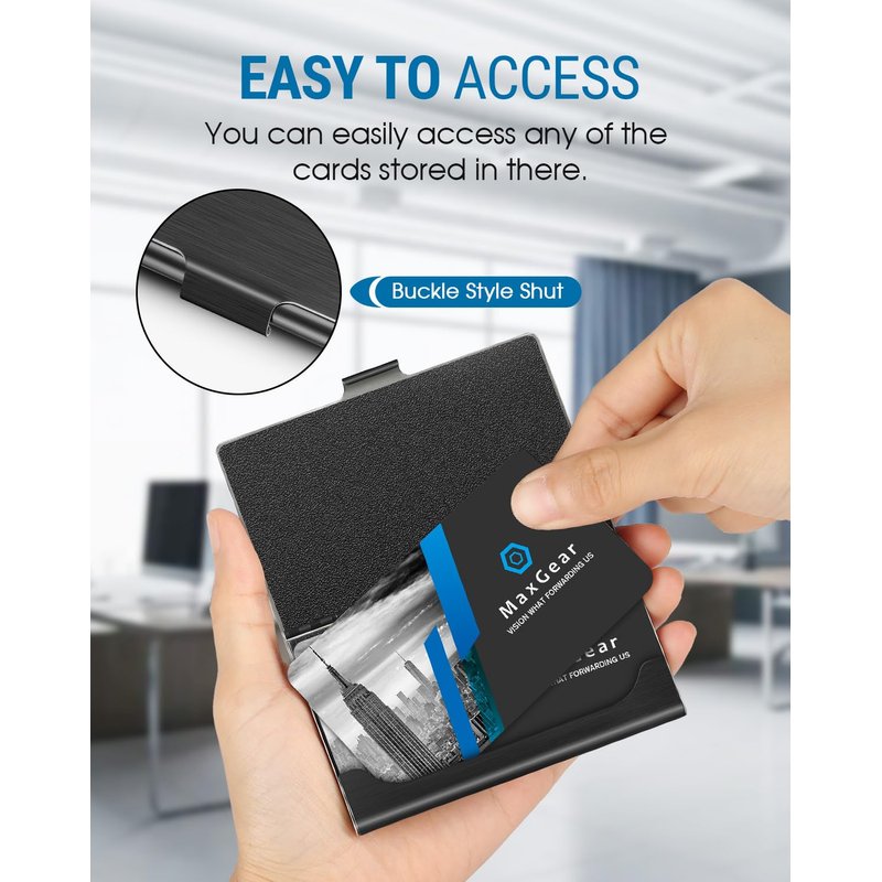 MaxGear Metal Business Card Holder for Men & Women, Professional Stainless Steel Card Case for Business Cards, Slim Purse Name Card Holders with Interior Lining, Buckle Style Shut, Black