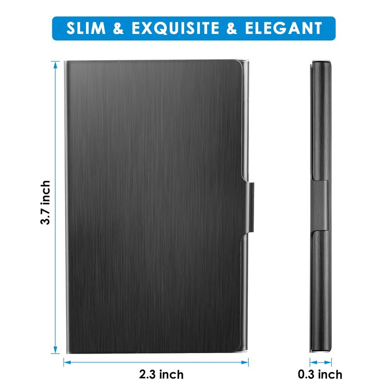 - Store approximately 10-20 business cards, also suitable for ID cards, credit cards, gift cards, and more. This business card case is made of premium stainless steel. Business card box with interior lining provides more protection to your cards. Size: 3.7"L x 2.3"W x 0.3"H