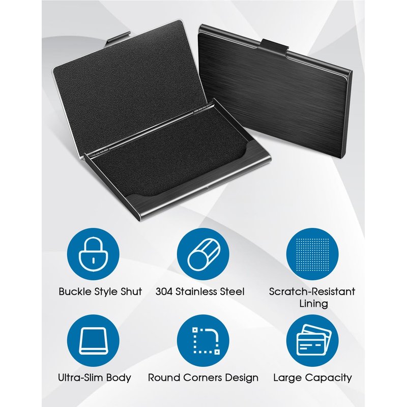 Awesome and cool business card holder; Just look at its edge, it's STURDY & DURABLE; you can send it to your colleagues, friends, and loved ones as a gift. Store approximately 10-20 business cards, also suitable for ID cards, credit cards, gift cards, and more. This business card case is made of premium stainless steel. Business card box with scratch-resistant interior lining provides more protection to your cards. Size: 3.7"L x 2.3"W x 0.3"H The absolute professional business appearance and feeling will help you leave a good first impression on your clients, associates, and entrepreneurs. Very steady and fashion stainless steel business card holder, slips into your pocket, fits your briefcase, handbag; just like a new one all the time!