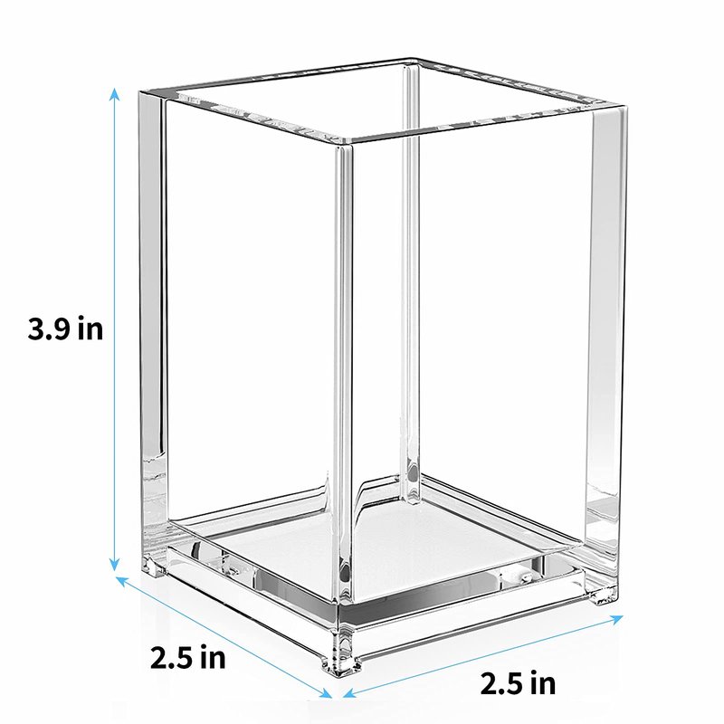 Acrylic Pencil Holder Brand: MaxGear Material: Premium Acrylic Quantity: 2 Pack Weight: 2 x 0.44 oz Color: Clear Dimensions: 2.6 x 2.6 x 4 inches Features: PREMIUM MATERIAL: This pen holder is made of Class A casting acrylic panel, strong toughness, not easy to break, much stronger than glass, which ensures its durability and security. The acrylic pen cup holder is totally waterproof, very easy to clean, just need some warm water and a piece of cotton cloth, it will look brand new again! MULTI-PURPOSE USE: The dimension of this product is 2.6 x 2.6 x 4 inches, which allows approximately 20 pencils to be contained. This pencil cup holder is not only a stationary for organizing your office accessories, but also can store the makeup brushes, lip/eye liners, glosses, blushes, hair accessories, nail polish, pens, lotions, perfumes, jewelry, Q-tips and more. Give you an uncluttered space. DELICATE CRAFTSMANSHIP: Pen holders are made out of one solid piece of premium quality acrylic material, no seam lines, no glued together. Solid construction with round edges makes pencil holder durable and feel great to touch. MODERN APPEARANCE: High transparent clear appearance makes it easy to locate the items, creates an elegant & modern office space for you. The color may vary due to the lighting, so pretty as a decorative piece for your workplace or your dressing room! Perfect choice as a gift!