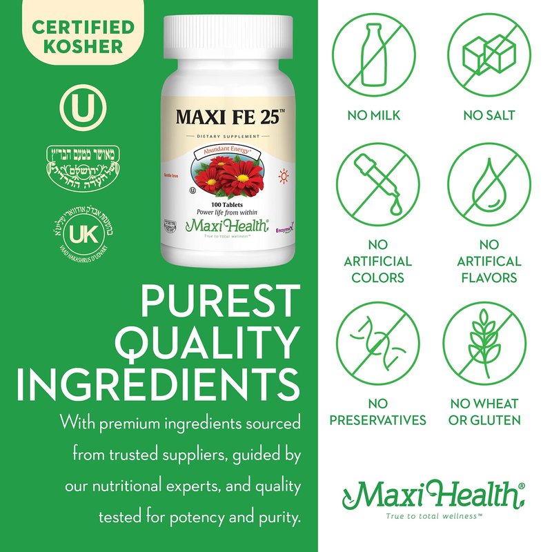 - VEGETARIAN & KOSHER CERTIFIED - Maxi is dedicated to formulating high-quality iron supplements for men & women using pure and natural ingredients that are certified Kosher. Contains no parabens, soy, wheat, salt, gluten, milk, artificial flavors, colorings, or preservatives.