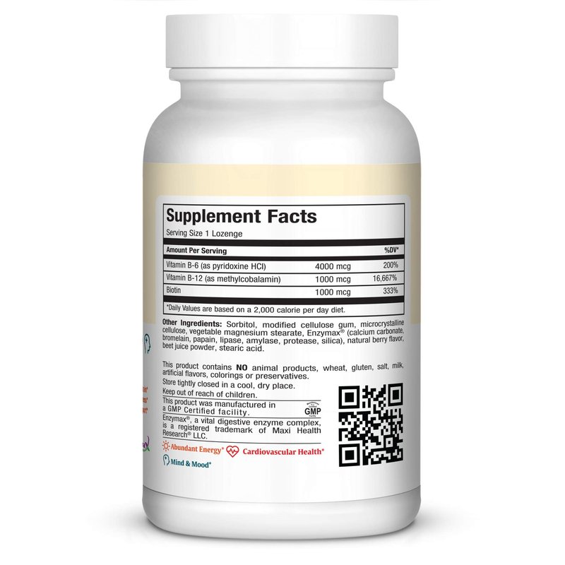 B12 Lozenges are B12 combined with Folic Acid and Biotin. It is vital for the function and maintenance of the nervous system and red blood cells. It may lower homocysteine levels and be useful in enhancing cognitive performance in older adults. Maxi Health Research brings you this easy to take supplement that combines B12, Folic Acid and Biotin. Together these key nutrients help maintain, a healthy cardiovascular and nervous system, hair and nail growth and they support optimum growth and function of all cells. B12 is essential for healthy nerve cells. It works with Folic acid to build the genetic materials of all cells, maintains healthy cell function and development, and assists in the production of enzymes. It is a key micronutrient that supports immunity and lymphocyte function. Folic Acid is important during pregnancy. It is vital for cell reproduction in the developing fetus, and helps prevent birth defects. Folic acid deficiency is common and can result in anemia and poor absorption problems. It helps support the normal formation of red blood cells, a healthy immune system, and enhances the effectiveness of vitamin B12. Studies of the general population have generally found that vitamins B12 and folic acid may lower homocysteine. Biotin helps maintain healthy hair and skin. It is especially important for protein and carbohydrate metabolism. For a formula that really works, Get B12 Lozenges today! These statements have not been evaluated by the Food and Drug Administration. This product is not intended to diagnose, treat, cure, or prevent any diseases.