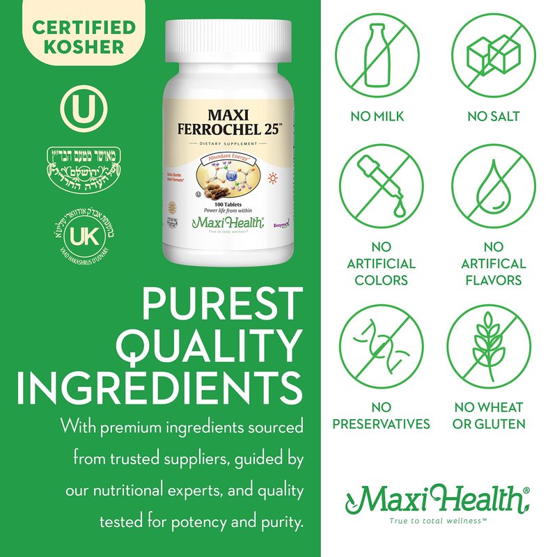- MAXI FERROCHEL 25 IRON - Maxi Ferrochel 25 iron supplement gently help support to get the iron you need. Gone are the old days when the only option you had was ferrous sulfate from the pharmacy. Your digestive tract treats it more like a food than a mineral.