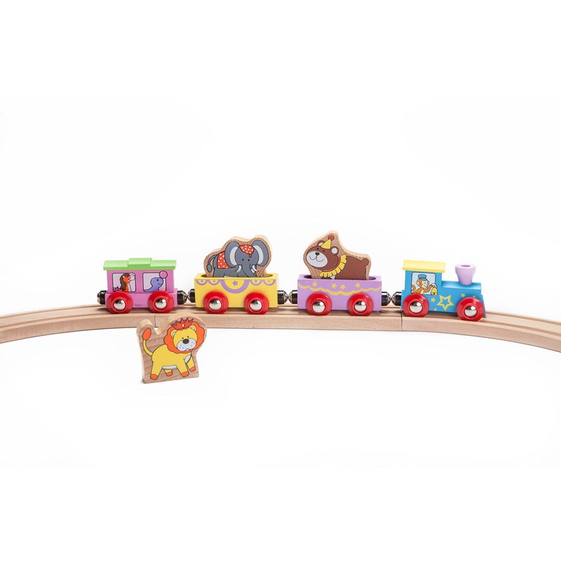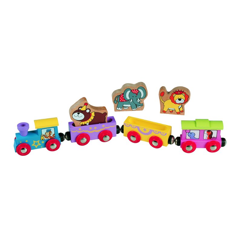 - Classic and Colorful Circus Train: This wooden train set is designed to captivate the imaginations of children age 3+. The bright colors and details will be loved by both boys and girls as the train rolls through town and country