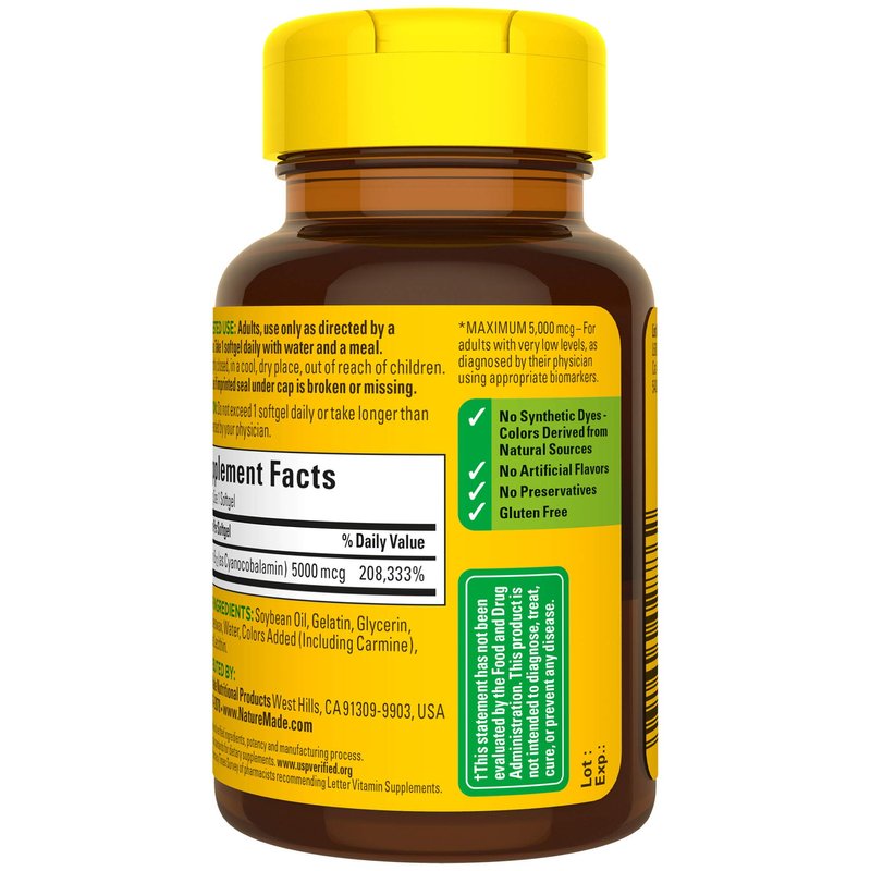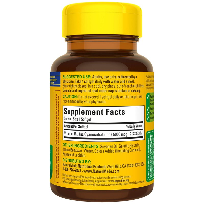 - Contains a 60-day supply of Nature Made Maximum Strength Vitamin B12 5000 mcg Softgels, 60 softgels per bottle.