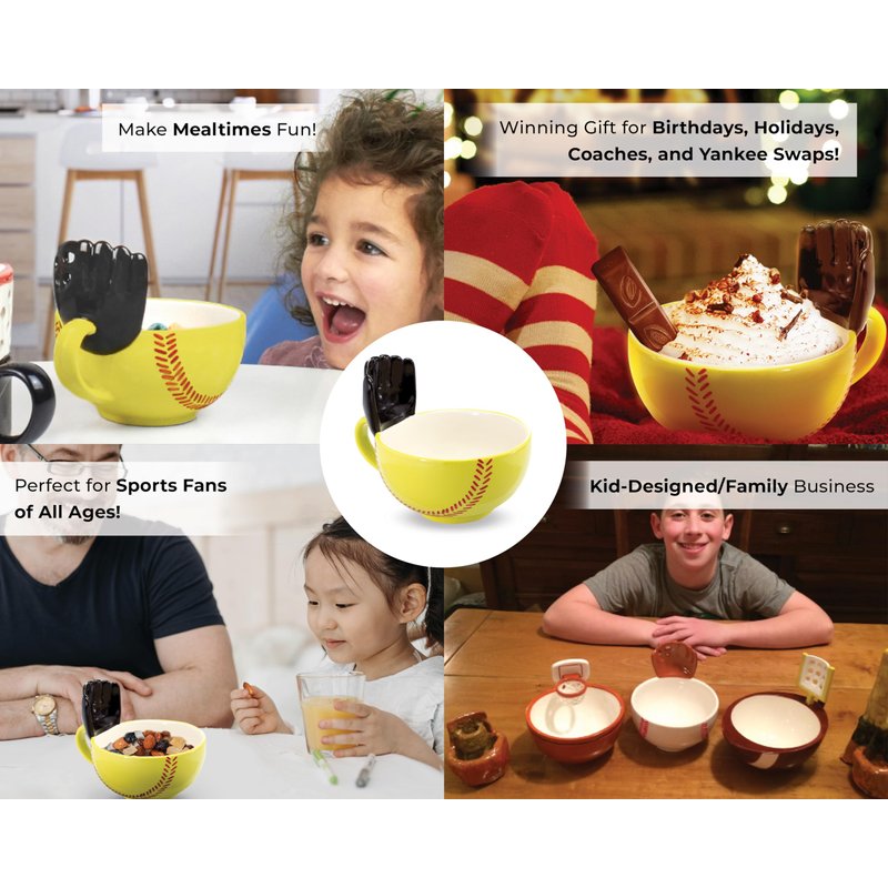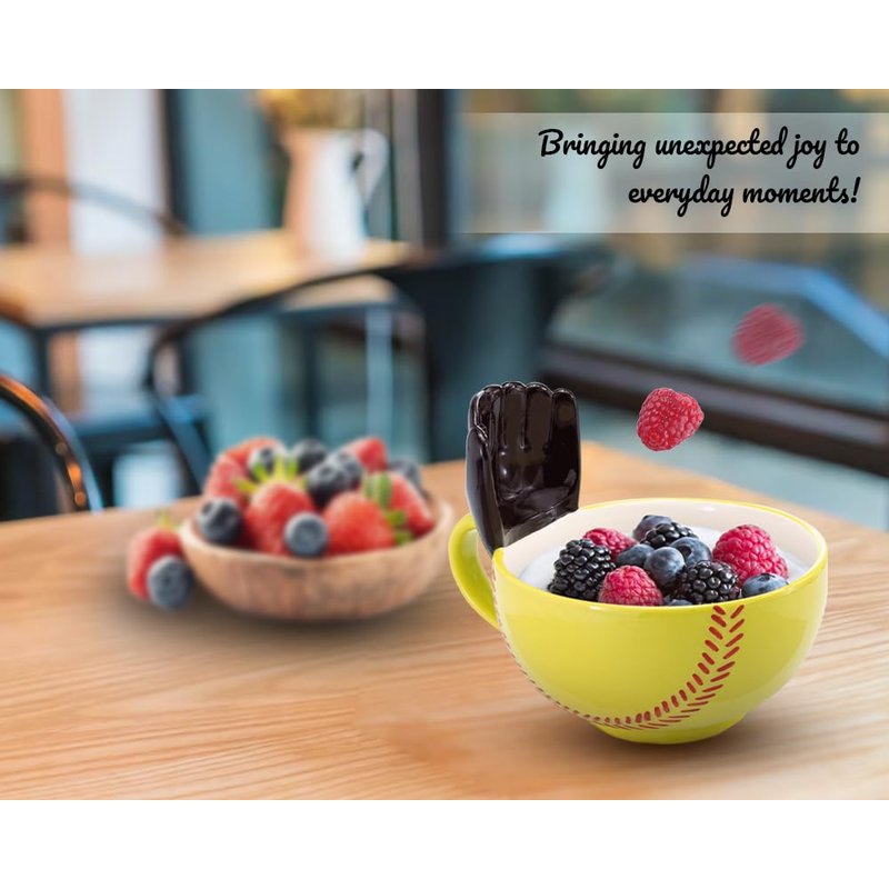 - Big Funny Coffee Mug – Interactive ceramic softball cereal/soup/rice bowl with a glove. Fun for tossing marshmallows into hot chocolate, cereal into milk or your favorite snacks.