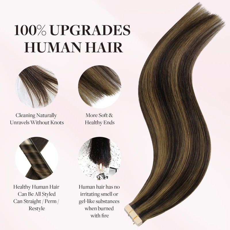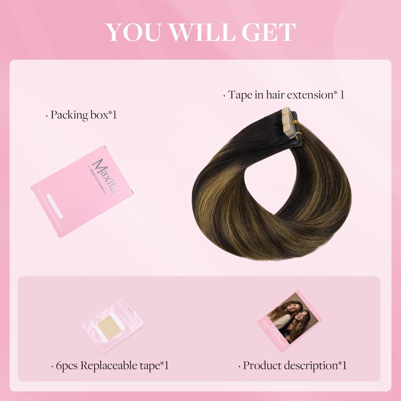MAXITA Hair Extensions Tape in Hair Extensions Human Hair 18 inch 50g 20pcs Balayage Dark Brown to Chestnut Brown Real Human Hair Extensions Real Remy Seamless Straight Hair Extensions for Women