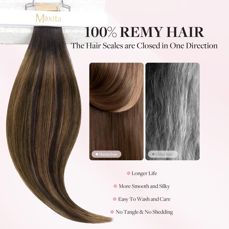 - 【Remy Human High Quality Hair】100% remy human hair extensions.Salon quality,thick & full ends,shiny,no tangles,no shedding,soft and smooth, feels like feathers,and can perfectly blend with your real hair.Hair can be washed, straighten, curled, etc. Hair extension is the same as our own hair, it needs careful care to make it last 4 months or more.