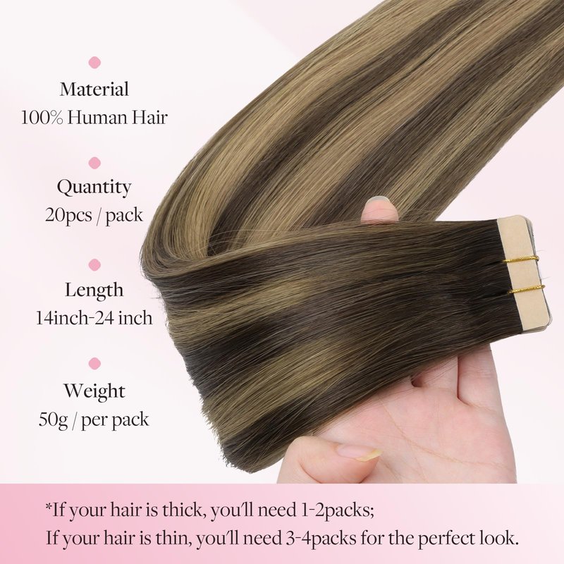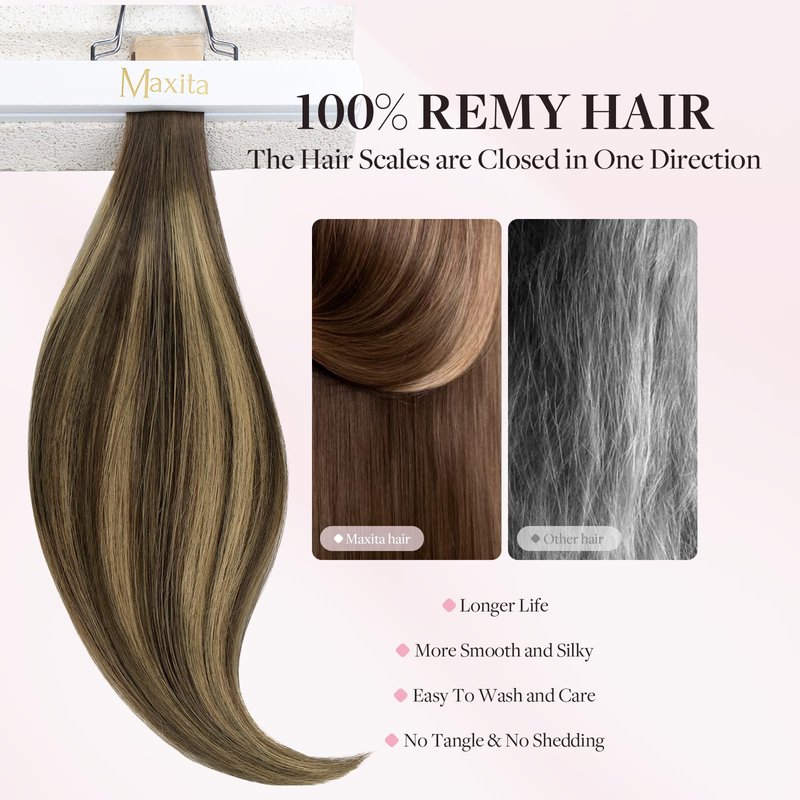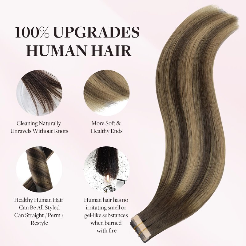 - Tape in Hair Extensions Quality: 100% remy human hair extensions, salon quality, thick & full ends, no split, no tangles, no shedding, soft and smooth, can perfectly blend with your own hair. It can be washed, straighten, curled, etc