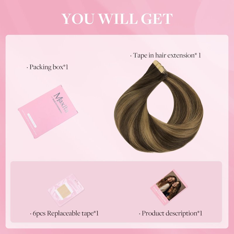 MAXITA Tape in Hair Extensions Human Hair 24inch 50g 20pcs Chocolate Brown to Caramel Blonde Real Human Hair Extensions Seamless Hair Extensions Remy Silky Straight Hair Extensions