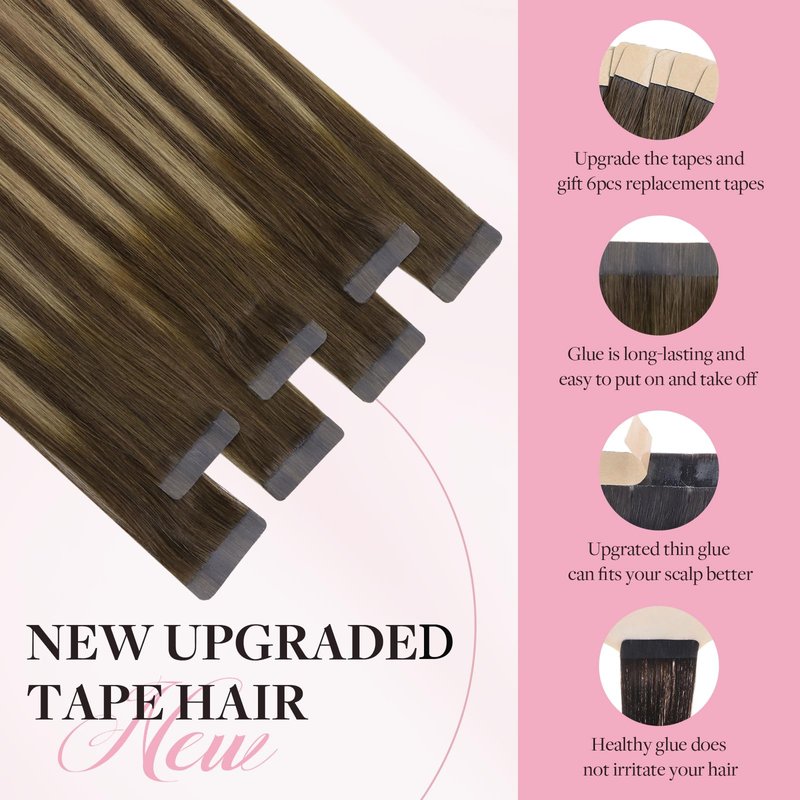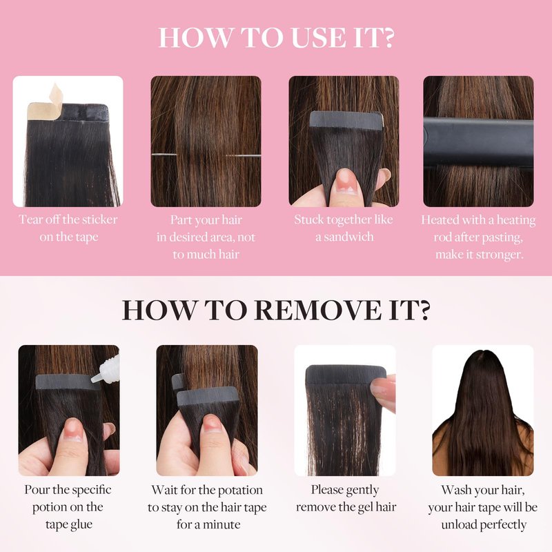 - Invisible tape in hair extensions: Adhesive double-sided tape has been upgraded with the latest ultra-thin glue, can make your scalp and tape fit better. Hair tape will be more fixed after heating, can be removed with cleaning fluid, no harm to your scalp