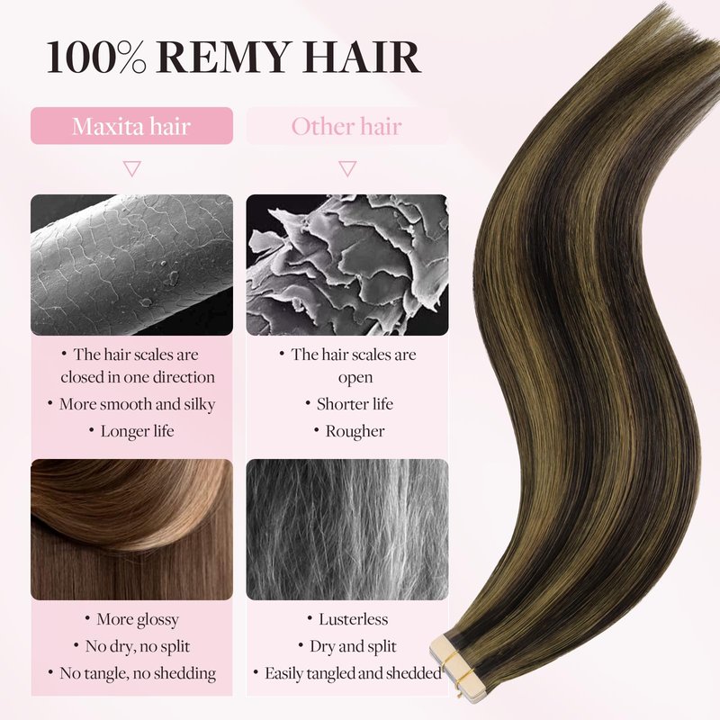 - 【Hair Protection】Prolonged exposure to sunlight can cause your extensions to fade or lose their shine. You can wear a hat to protect your hair extensions. Avoid swimming in saltwater or chlorinated water, as it can damage the extensions, causing them to dry out and tangle. Tape in hair extensions is light in weight, Wear it once can last for 4-6 Weeks, with proper care, These tape in extensions can be re-used multiple times.