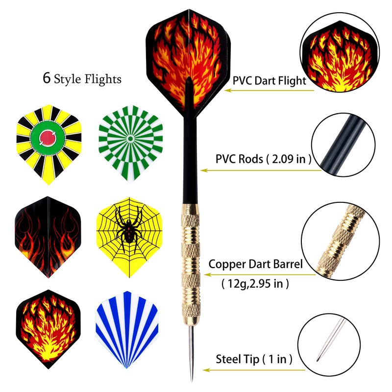 - ★Quanlity Material: Stainless steel dart tips,nice copper-covered barrels,strong PC dart shafts and durable PET dart flights